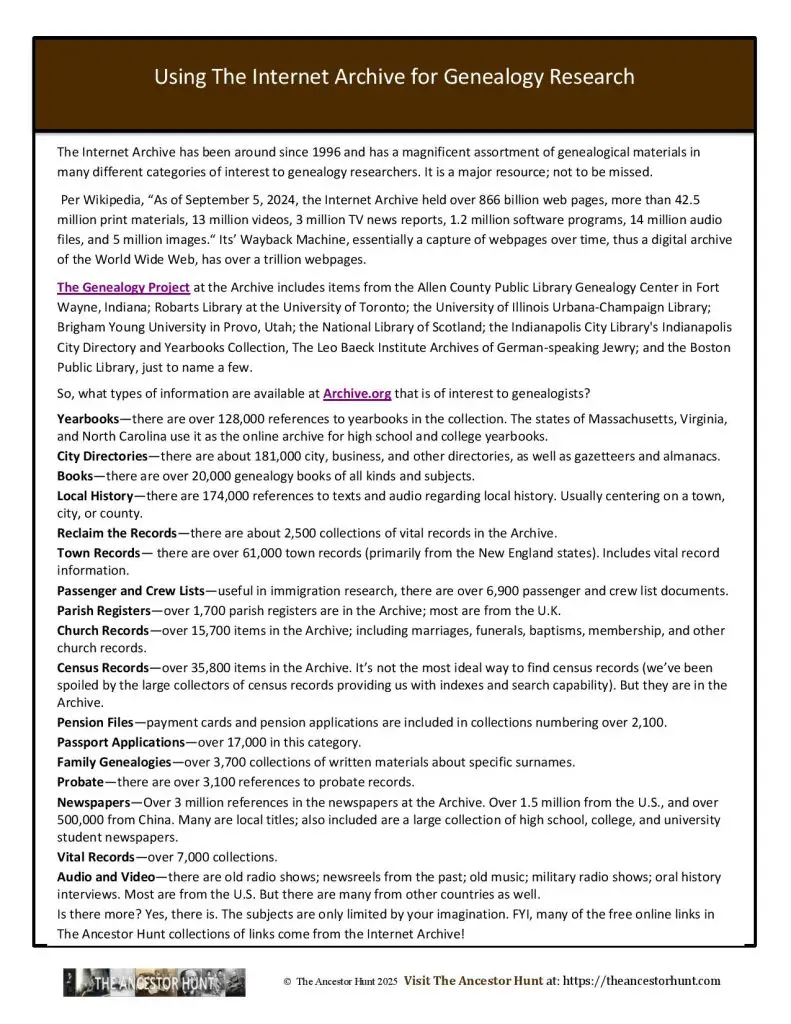 To obtain the one-page QuickSheet pdf for easy reference of what genealogical materials are available at the Internet Archive, you can download it for free by clicking on the Download button: