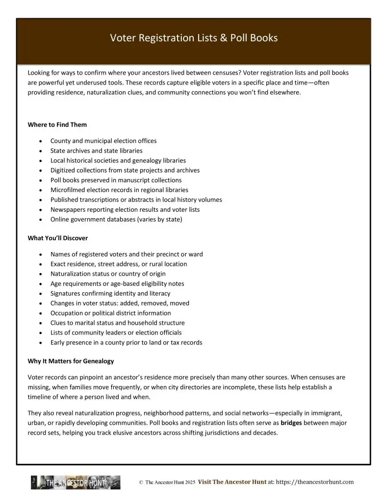 Looking for ways to confirm where your ancestors lived between censuses? Voter registration lists and poll books are powerful yet underused tools. These records capture eligible voters in a specific place and time—often providing residence, naturalization clues, and community connections you won’t find elsewhere.