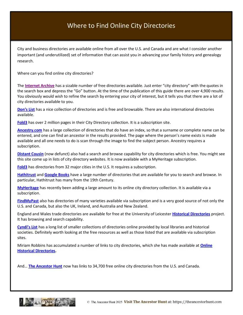 City and business directories are available online from all over the U.S. and Canada and are what I consider another important (and underutilized) set of information that can assist you in advancing your family history and genealogy research.