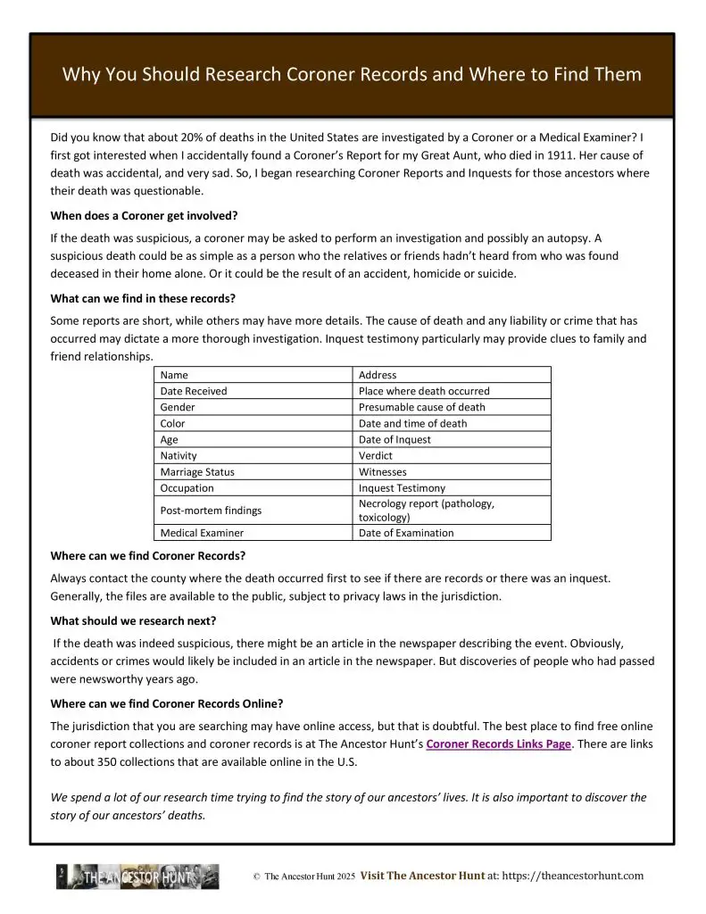 Did you know that about 20% of deaths in the United States are investigated by a Coroner or a Medical Examiner? I first got interested when I accidentally found a Coroner’s Report for my Great Aunt, who died in 1911. Her cause of death was accidental and very sad. So I began researching Coroner Reports and Inquests for those ancestors where the death was questionable. The Quicksheet has answers to these questions: